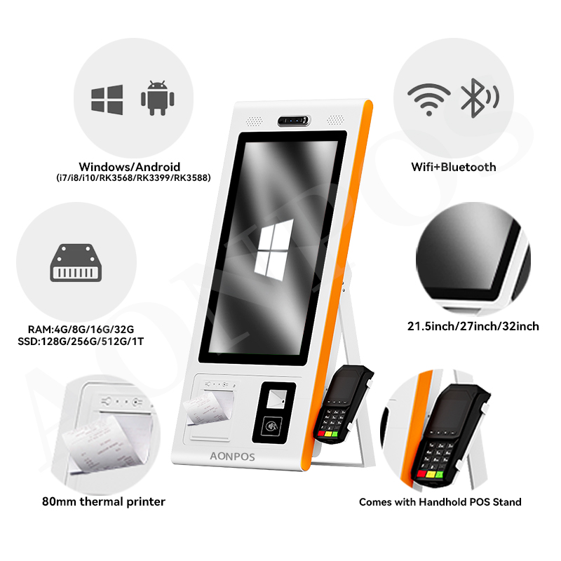 The self-service ordering machine is a modern dining service device designed to enhance the dining experience for customers and improve service efficiency. Through a touch screen interface, customers can easily browse the menu, select their desired items, and place orders themselves, reducing labor costs and minimizing errors. They bring an innovative service model to the food and beverage industry, enhancing customer satisfaction and operational efficiency. Item NO: APK07 Color: White / Black Min Order: 1 CPU: RK3568/I5/I7 (optional) Memory: DDR3 4G/8G/16G (optional) Hard Drive: mSATA SSD 64GB/128G/256G/1TB (optional) Screen: 21.5/27/32 inch capacitive touch screen