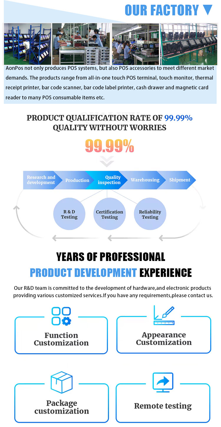 Aonpos: Each POS machine will ageing test 72hours ,to guarantee all POS machine are in the perfect condition before shipment .we also accept the inspection by the third part you appointed.